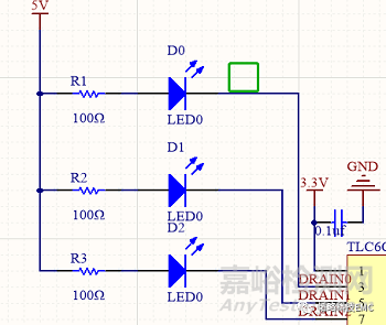 我們在靠近芯片引腳DRAIN0處接入靜電管TEVC1R0V05B1X,這個(gè)靜電管結(jié)電容很小,所以對LED燈的亮滅時(shí)間影響不大,然后在LED(D0)的負(fù)極進(jìn)行+2.5KV放電,發(fā)現(xiàn)三個(gè)LED燈都沒有再熄滅,在LED(D1)、LED(D2)處放電,發(fā)現(xiàn)LED燈依然會熄滅再點(diǎn)亮,最后我們在靠近TLC6C5912驅(qū)動(dòng)芯片的三個(gè)DRAIN引腳都接入靜電管TEVC1R0V05B1X,再進(jìn)行測試,發(fā)現(xiàn)再也沒有發(fā)生LED燈熄滅的狀況,在裝上機(jī)殼測試的時(shí)候,也沒有出現(xiàn)LED燈熄滅再點(diǎn)亮的現(xiàn)象。