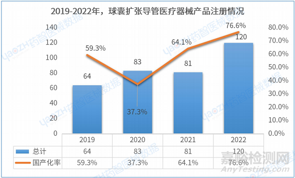 截至2023年5月,球囊擴(kuò)張導(dǎo)管醫(yī)療器械產(chǎn)品在有效期內(nèi)產(chǎn)品注冊(cè)總數(shù)為398件。其中,國(guó)產(chǎn)產(chǎn)品有253件,占比63.5%。2019-2021年注冊(cè)數(shù)量總體呈上升趨勢(shì),國(guó)產(chǎn)注冊(cè)產(chǎn)品也在逐漸增多,2022年國(guó)產(chǎn)占比率達(dá)到了76.6%。