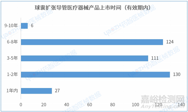 據(jù)統(tǒng)計(jì),從產(chǎn)品進(jìn)入市場(chǎng)的平均時(shí)間來(lái)看,在有效期內(nèi)的球囊擴(kuò)張導(dǎo)管醫(yī)療器械產(chǎn)品的上市時(shí)間在1-2年的產(chǎn)品數(shù)量最多,有130件。