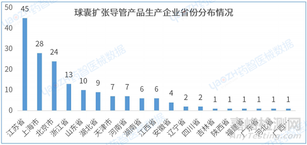 3.2 球囊擴(kuò)張導(dǎo)管產(chǎn)品生產(chǎn)企業(yè)省份分布情況