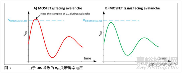 在超過 MOSFET 的擊穿電壓時,通常會發(fā)生雪崩,這通常是由于非鉗位電感開關(guān)(UIS) 造成的,其中器件的使用超出了其數(shù)據(jù)表規(guī)范。因此,設(shè)計人員應(yīng)盡一切合理努力避免 MOSFET 工作在雪崩狀態(tài)。實際上,在大電流應(yīng)用中,由于 MOSFET 封裝和 PCB 走線中的寄生電感或變壓器漏感(例如在反激式轉(zhuǎn)換器中),會導(dǎo)致關(guān)斷瞬態(tài)高壓。通過漏極電壓的鉗位效應(yīng)可觀察雪崩。