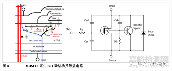 在這種情況下,雪崩事件會產(chǎn)生漏極電流,在電場強度更大的位置,漏極電流也會更大。閂鎖效應(yīng)是由寄生在功率MOSFET 中的 NPN 雙極結(jié)型晶體管 (BJT)產(chǎn)生。如果器件的結(jié)構(gòu)使得寄生 BJT 附近的電場很高,則大量電流將流過其基極電阻,從而在基極和發(fā)射極之間產(chǎn)生電壓。如果此電壓達到某個閾值,雙極晶體管就會導(dǎo)通,大部分雪崩電流會流經(jīng)它,從而產(chǎn)生潛在的破壞性影響,因為沒有辦法可以控制電流。