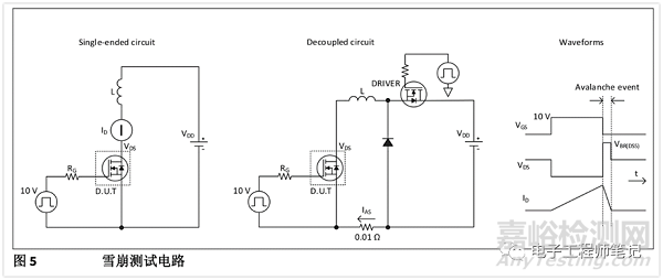 在去耦電路中,兩個 MOSFET 同時導(dǎo)通和關(guān)斷,因此電感電壓等于施加在 MOSFET 漏極和源極之間的電壓。關(guān)斷瞬態(tài)上升至V(BR)DSS 以上,這樣在雪崩條件下,存儲在電感中的能量(由脈沖長度和電感定義)可以傳輸?shù)組OSFET。英飛凌實施雪崩應(yīng)力測試以確保符合 EAS 等級、驗證穩(wěn)固性并篩選有缺陷的器件。