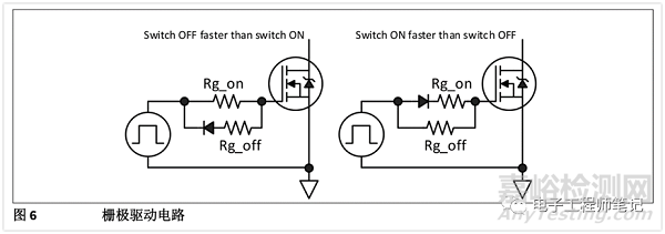感應(yīng)導(dǎo)通可以通過減緩開關(guān)轉(zhuǎn)換速度來降低,從而降低 dv/dt。這可以通過增加 Rg_on 來減緩高側(cè)器件的導(dǎo)通速度來實現(xiàn)(參見圖 6)。根據(jù)電路開關(guān)特性,高側(cè)和低側(cè)柵極驅(qū)動網(wǎng)絡(luò)可能相同,也可能不同。降低導(dǎo)通速度也會降低輻射 EMI,但也會增加開關(guān)損耗,因此需要謹慎考慮權(quán)衡取舍。