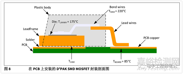 RDS(on) 與結(jié)殼熱阻 RTH(JC) 結(jié)合使用,2 可以更好地顯示功率 MOSFET 的真實電流承載能力。以下焊接到PCB上的典型的 SMD 封裝 功率 MOSFET 的剖面圖提供了更清晰的圖像。管芯底部連接到金屬片,使漏極與電路板相連接。源極和柵極連接通過鍵合線連接到形成外部引線的引線框架。由于漏極電流流經(jīng)源極,因此使用了幾根鍵合線,有時還會用到幾根源極引線。在一些大電流器件中,會使用銅夾代替源極鍵合線以實現(xiàn)更低的電阻。
