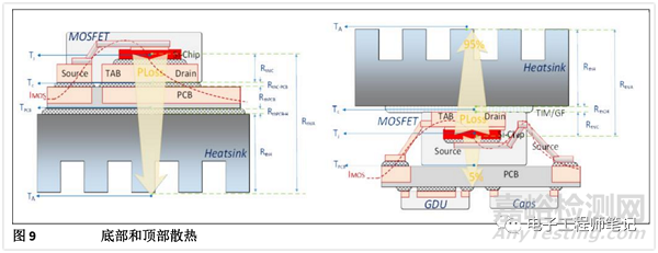 除了散熱器尺寸和表面積(由翅片的形狀和數(shù)量決定)外,還必須考慮結(jié)至環(huán)境熱阻。這取決于所使用的散熱器布局,可以通過將結(jié)與散熱器之間的所有串聯(lián)熱阻(包括 PCB、隔熱材料/TIM 等)以及散熱器本身的熱阻相加來計算熱阻(參見圖 9)。顯然,需要低結(jié)至環(huán)境熱阻來有效地傳遞 MOSFET 管芯的熱量,并使其能夠安全地傳導(dǎo)盡可能高的電流。