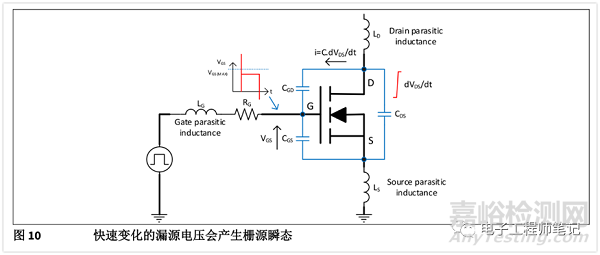 在柵極驅(qū)動的導(dǎo)通或關(guān)斷操作期間,當器件從導(dǎo)通狀態(tài)轉(zhuǎn)換至關(guān)斷狀態(tài)時會產(chǎn)生高 dVDS/dt,反之亦然。考慮到柵極、源極和漏極引線中存在寄生電感,以及 MOSFET CGD(米勒電容),可以理解的是,這些寄生參數(shù)的組合會在柵極和源極之間產(chǎn)生瞬態(tài)電壓。幸運的是,柵極電容 CGS 可以減輕這種影響。