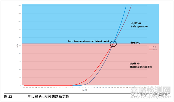 在給定的 VGS 值下,漏極電流隨溫度增加,就會發(fā)生熱不穩(wěn)定。VGS 值低于零溫度系數(shù) (ZTC) 點時會出現(xiàn)這種情況。在較高的 VGS 水平下,漏極電流隨溫度降低。如 圖 13 所示。