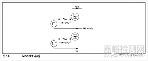 如果感應(yīng)尖峰超過了 MOSFET VTH,則在高側(cè) MOSFET 完全關(guān)斷之前,器件將短暫部分導(dǎo)通。當兩個器件都部分導(dǎo)通時,高電流會流過半橋,這可能會超出 SOA 限制并損壞一個或兩個器件。