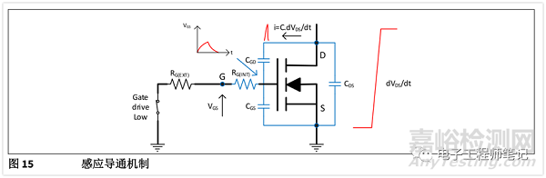 圖 15 顯示了“C.dv/dt”如何使電流脈沖通過 CGD 耦合至柵極,柵極電壓通過 RG(EXT) 將其拉至零伏狀態(tài)。該電流脈沖可以在柵極處引起電壓尖峰。重要的是要記住,MOSFET 也可能具有很大的內(nèi)部柵極電阻RG(INT),因此出現(xiàn)在晶圓上的感應(yīng)柵極尖峰可能比在柵極端子處觀察到的尖峰大。