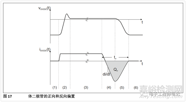 在區(qū)間(1),二極管處于關(guān)斷狀態(tài),并在區(qū)間(2)開始導(dǎo)通。在導(dǎo)通過程結(jié)束時,二極管變?yōu)檎蚱谩7聪蚧謴?fù)電荷累積并存儲,而正向偏置二極管在區(qū)間 (3) 期間承載正電流。在關(guān)斷區(qū)間 (4) 開始時,電流減小到零,然后以相反方向流動。在區(qū)間 (5) 期間完成反向恢復(fù),在區(qū)間 (6) 完成關(guān)斷過程,此時二極管處于阻塞狀態(tài)。圖中的陰影區(qū)域表示Qrr,這是硬換向穩(wěn)固性的關(guān)鍵器件參數(shù)。
