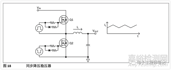 在上一節(jié)所述的半橋功率開關(guān)電路中,在將高開關(guān)電流進入到感應(yīng)負載時,體二極管反向恢復(fù)就變得很重要??紤]一個在連續(xù)導(dǎo)通模式 (CCM) 下工作的同步降壓穩(wěn)壓器,Q1 導(dǎo)通,Q2 關(guān)斷,其中電流 IL 從半橋開關(guān)節(jié)點流出。