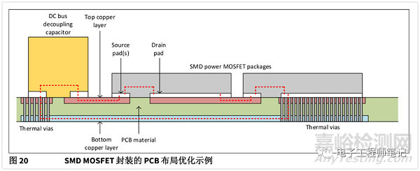 不同的功率 MOSFET 封裝,其寄生電感不同,引線封裝電感比 SMD 封裝更高,而且 SMD 封裝中存在的電感量取決于漏極和源極連接的內(nèi)部幾何形狀。因此,有必要考慮任何設(shè)計所需的封裝類型,不僅要考慮其熱特性,還要考慮封裝電感,而數(shù)據(jù)手冊中可能沒有明確說明。簡而言之,在硬換向中開關(guān)電流高時,SMD 封裝的電感要盡可能低,還需要良好的PCB 布局,以實現(xiàn)可接受的性能,并避免可靠性和潛在的 EMI問題。在為電源應(yīng)用設(shè)計 PCB 時,建議使用制造商推薦的器件封裝,并確保遵循處理和焊接指南。