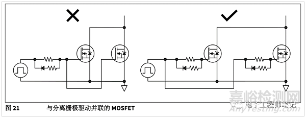 柵極驅(qū)動電路的設(shè)計也很關(guān)鍵。由于當?shù)谝粋€ MOSFET 導(dǎo)通時,并聯(lián) MOSFET 不太可能同時導(dǎo)通或關(guān)斷,因此在源極節(jié)點處會出現(xiàn)快速電壓擺動。這可以通過較慢并聯(lián)器件的 CGD 耦合,并在共享柵極連接處產(chǎn)生電壓尖峰。這會在 MOSFET 快速導(dǎo)通和關(guān)斷時產(chǎn)生振蕩,可能會損壞MOSFET 和柵極驅(qū)動器。為防止出現(xiàn)這種情況,每個并聯(lián) MOSFET 都應(yīng)有自己的柵極驅(qū)動網(wǎng)絡(luò),放置在柵極和柵極驅(qū)動器的共享連接點之間。