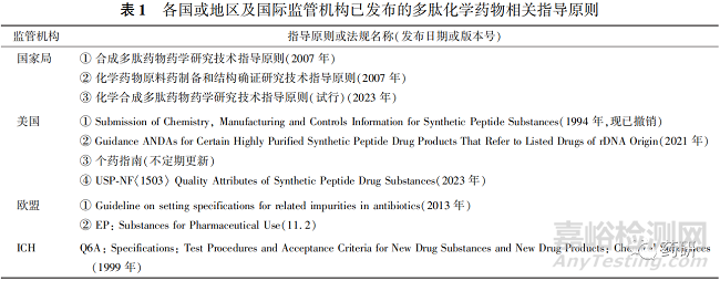 國相比普通小分子化學(xué)藥,目前各國監(jiān)管機構(gòu)和規(guī)際組織對多肽化學(xué)藥物的技術(shù)要求尚不完善,法舉文件相對缺乏,存在一定的監(jiān)管空白。 表 1 中列了各國及國際監(jiān)管機構(gòu)目前僅有的幾個涉及多肽化學(xué)藥物的官方技術(shù)支持文件。 其中國家藥品監(jiān)督管理局(以下簡稱國家局) 早在 2007 年就出臺了《合成多肽藥物藥學(xué)研究技術(shù)指導(dǎo)原則》,說明我國很早就開始重視這類藥物的研發(fā)和監(jiān)管問題,同時在《化學(xué)藥物原料藥制備和結(jié)構(gòu)確證研究技術(shù)指導(dǎo)原則》中也提到了關(guān)于多肽藥物的一些關(guān)鍵技術(shù)要求。 上述指導(dǎo)原則在出臺后的 10 多年間對我國多肽化學(xué)藥物的發(fā)展起到了一定的促進作用, 但由于種種原因未能及時升級更新,已不能充分滿足目前多肽藥物研究與審評的需要,且在我國仿制藥一致性評價的大背景下,考慮到多肽藥物的復(fù)雜性,上述指導(dǎo)原則在評價仿制藥與參比制劑的一致性方面還有進一步完善的空間。 最近,國家藥品監(jiān)督管理局藥品審評中心為進一步指導(dǎo)化學(xué)合成多肽藥物的藥學(xué)研究,提供可參考的技術(shù)標(biāo)準(zhǔn),于 2023 年 2 月發(fā)布了《化學(xué)合成多肽藥物藥學(xué)研究技術(shù)指導(dǎo)原則(試行)》[3],為未來一段時間內(nèi)我國多肽仿制藥的研發(fā)和監(jiān)管提供了依據(jù)。 國外監(jiān)管機構(gòu)中,ICH Q系列指導(dǎo)原則中的 Q3A 和 Q3B 明確不適用于肽類藥物;Q6A 顯示適用于小于 10 個氨基酸的低分子量合成肽,但不適用于高分子肽和多肽,且并未就多肽化學(xué)藥物的特殊要求進行專門闡述;Q6B 明確不適用于合成肽。 歐盟未曾發(fā)布專門針對多肽化學(xué)藥物的指導(dǎo)原則,僅在抗生素藥物雜質(zhì)限度指導(dǎo)原則及歐洲藥典藥用物質(zhì)通則中提到了多肽藥物雜質(zhì)控制的一般要求。 美國 FDA 曾于 1994 年頒布過關(guān)于遞交合成多肽原料藥申請藥學(xué)資料的相關(guān)要求,但目前該文件已失效。 不過美國 FDA 近期就多肽化學(xué)仿制藥的研究公布了多個復(fù)雜多肽仿制藥的個藥指南,并在 2021 年頒布了《仿制重組 DNA 來源藥物的高純度合成多肽藥物指導(dǎo)原則》[4],說明國際監(jiān)管機構(gòu)也開始逐漸致力于完善多肽仿制藥監(jiān)管體系的建設(shè)工作。