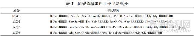 該品種于20 世紀(jì) 80年代之前已在美國上市,用于因注射肝素過量引起的出血。 目前國內(nèi)有 3 家仿制藥上市,但獲批時間均較早,且尚未進行一致性評價。 其原料藥為從大馬哈魚體內(nèi)提取的一種堿性蛋白質(zhì)的硫酸鹽,為多肽混合物,其中 4 種主要多肽(見表 2)總含量超過90% ,剩余由次要多肽組成。 由于含有多個成串的精氨酸,且 4 種主要多肽氨基酸序列非常相似,因此分離純化和質(zhì)量分析均存在難度。 考慮到魚源及提取工藝的不同可能會造成仿制藥的原料藥多肽組成與參比制劑的差異,因此應(yīng)采用適當(dāng)?shù)姆椒ㄈ娑ㄐ约岸糠治霎a(chǎn)品組成并與參比制劑對比,以確保仿制藥質(zhì)量符合要求。