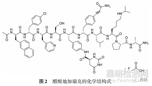該品種分別于 2008 和 2009年在美國和歐洲上市,于 2018 年批準(zhǔn)進口我國,為第 3 代促性腺激素釋放激素(GnRH) 受體阻斷劑,對雄激素依賴性腫瘤有治療作用,適用于需要雄激素去勢治療的前列腺癌患者,目前國內(nèi)外均無仿制藥上市。 其原料藥為化學(xué)合成線性十肽(圖 2),含7 個非天然氨基酸。原料藥易溶于水,但室溫下在0. 1 ~ 10 mg·mL-1濃度的水溶液中會自發(fā)聚集,4h后呈凝膠狀。 該過程受濃度、時間、溫度、鹽含量和蛋白質(zhì)等因素的影響,因此其制劑凍干粉復(fù)溶后雖在體外 1 h 內(nèi)穩(wěn)定性良好,但皮下給藥接觸體液后立即形成凝膠,藥物從凝膠中緩慢釋放,從而起到長效給藥的作用[8]。目前發(fā)現(xiàn)GnRH類似物在水溶液中均有自聚集現(xiàn)象,聚集體的結(jié)構(gòu)和形成凝膠的性質(zhì)因化合物而異。 地加瑞克由于為兩性分子,主要是通過親水端和疏水端相互結(jié)合,并延長聚集形成纖維網(wǎng)絡(luò)最終形成凝膠。 原料藥的這種有條件聚集的特性對制劑最終的安全有效性影響極大,藥學(xué)研究與評價均存在一定的難度。