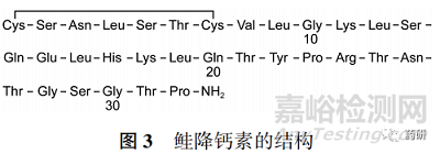 該品種于20 世紀(jì) 80 年代前在美國上市,用于治療骨質(zhì)疏松。 其原料藥為來源于大馬哈魚體內(nèi)的一種 32 肽,結(jié)構(gòu)中含 1 個二硫鍵(圖3),目前上市品來源多為化學(xué)合成或生物重組。 目前已有多個仿制藥在我國上市,但上市時間均較早,且尚未進行一致性評價。 該品種結(jié)構(gòu)或物化特性相對并不復(fù)雜,但由于仿制藥制備工藝與原研藥明顯不同,因此更需關(guān)注雜質(zhì)控制的合理性,特別是來源于制備工藝的特有雜質(zhì)。 對于多肽化學(xué)藥物雜質(zhì)研究來說,通常需同時綜合應(yīng)用不同原理的方法進行交叉研究,重點關(guān)注方法對肽類雜質(zhì)的分離和檢出能力。