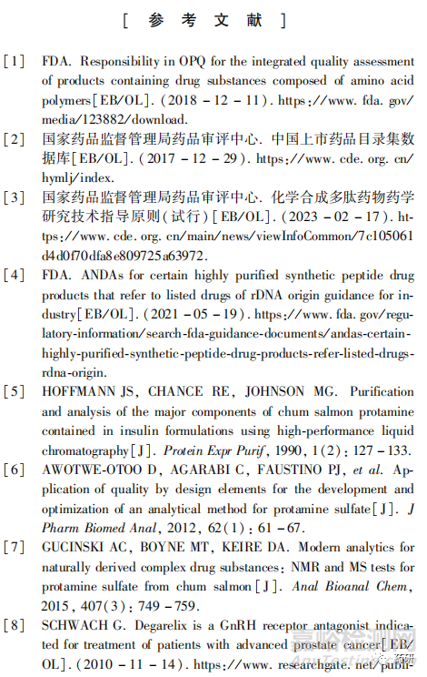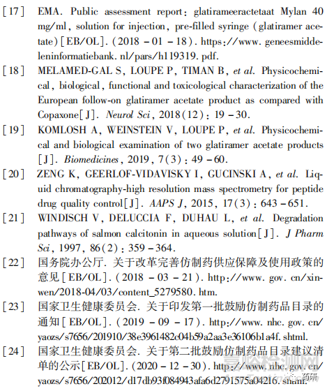 綜上所述,多肽仿制藥的研究應(yīng)符合仿制藥研究的一般要求,同時要考慮其技術(shù)上的特殊性,仿制藥結(jié)構(gòu)和物化特性與參比制劑的等同及對雜質(zhì)的合理控制是獲得成功的關(guān)鍵,應(yīng)結(jié)合品種特點科學(xué)制定研究方案。 目前市場上多肽藥品數(shù)量很多,但質(zhì)量良莠不齊,多肽藥物的研發(fā)和監(jiān)管水平均亟須提升。 2018 年國務(wù)院辦公廳發(fā)布了《關(guān)于改革完善仿制藥供應(yīng)保障及使用政策的意見》[22],提出要制定鼓勵仿制的藥品目錄,目前已發(fā)布的2批目錄[23 - 24]共計50個品種中,就包括了格拉替雷和普卡那肽等多個多肽藥物品種,說明國家非常重視多肽仿制藥的發(fā)展。同時該文件還要求健全產(chǎn)學(xué)研醫(yī)用協(xié)同創(chuàng)新機制,建立仿制藥技術(shù)攻關(guān)聯(lián)盟,發(fā)揮企業(yè)的主導(dǎo)作用和醫(yī)院、科研機構(gòu)、高等院校的基礎(chǔ)支撐作用,加強仿制藥的技術(shù)攻關(guān)。 希望通過本文與業(yè)界對多肽化學(xué)仿制藥進行交流,并促進更多更好的多肽仿制藥加快上市,提高我國患者的用藥可及性。
