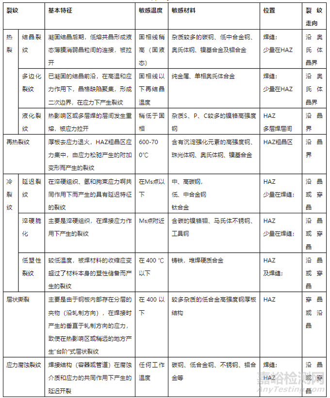 簡單理解焊接性就是焊接中避免形成焊接缺欠并滿足使用性能的難易程度,焊接缺欠及性能問題主要指焊接裂紋及焊接熱影響區(qū)性能惡化,焊接裂紋種類較多,有熱裂及冷裂等,如表1所示。
