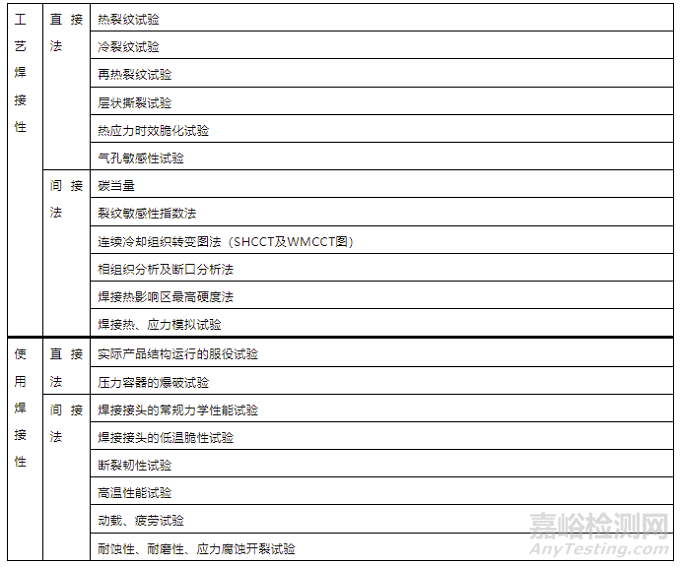 一般來說材料生產(chǎn)商會在材料商用化之前做大量的、完整的焊接性評價,并給出相應焊接工藝推薦及注意事項,如焊接t8/5區(qū)間,預熱及熱輸入要求等,對于特殊的、要求嚴格的應用,客戶需要根據(jù)設計要求對目標材料進行所需的焊接性評定或焊接工藝評定。焊接評價主要方法見表2。