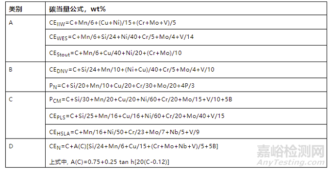 Yurioka將一些用于評估焊接性的碳當量分為以下幾大類,更加明確其適用的場合,如下所示: