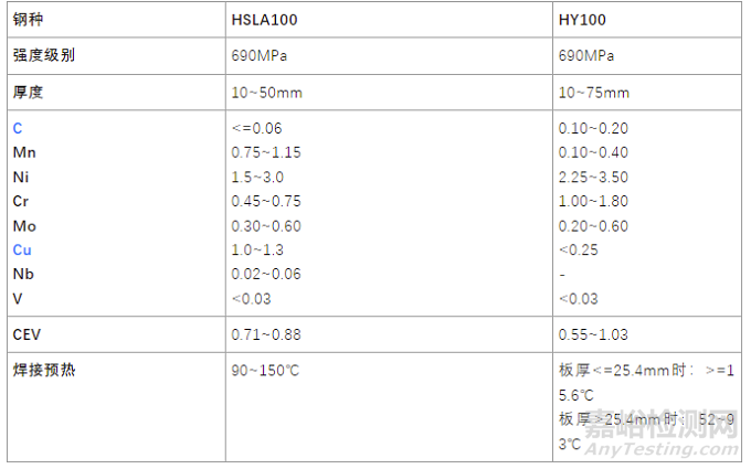 下表為美國先后用于船舶生產(chǎn)的HY100和HSLA100鋼,碳含量,碳當量,其他成分及焊接所需預熱對比。