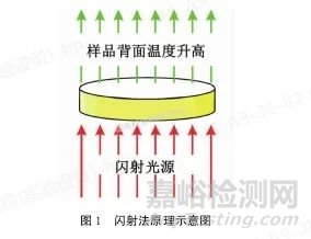 激光閃射法測(cè)試原理為使用高強(qiáng)度的能量脈沖對(duì)小而薄的試樣進(jìn)行短時(shí)間的輻射,用紅外檢測(cè)器測(cè)量樣品表面的溫度變化,得到表面溫度升高到最大值的一半所需要的時(shí)間,即為升溫時(shí)間t1/2,進(jìn)而準(zhǔn)確地測(cè)量出固態(tài)材料的熱擴(kuò)散系數(shù)。閃射法原理示意圖如圖1所示: