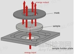 支架的設(shè)計(jì)使樣品底部接受光脈沖照射(底座中心約5mm左右的圓),該能量在樣品內(nèi)部沿著兩個(gè)方向傳導(dǎo):一是垂直向上方向,二是水平方向。沿垂直方向直接傳導(dǎo)的中心區(qū)域能量會(huì)被樣品上方的樣品支架蓋子所遮擋,因此不能被檢測(cè)器檢測(cè)到;而水平方向傳遞的能量經(jīng)過一段時(shí)間的傳導(dǎo)以后,經(jīng)過樣品支架蓋子的鏤空區(qū)域出來,能被檢測(cè)器檢測(cè)到;所以檢測(cè)器檢測(cè)得到的信號(hào)是經(jīng)過了平面?zhèn)鲗?dǎo)一段距離后的那部分激光能量(沿垂直方向傳導(dǎo)的影響可通過模型進(jìn)行修正)。通過耐馳特有的In-Plane數(shù)學(xué)模型對(duì)測(cè)量結(jié)果進(jìn)行擬合分析,能準(zhǔn)確計(jì)算材料平面方向的熱擴(kuò)散系數(shù)。在軟件中輸入密度、厚度、比熱容等物理量能得到導(dǎo)熱系數(shù)。