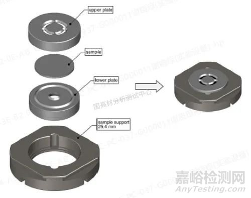 樣品制備成25mm左右的圓片,放置在樣品架底座上,加上蓋子,將整套支架放入標(biāo)準(zhǔn)樣品托盤中,如上圖所示。并將托盤放入爐腔內(nèi)。