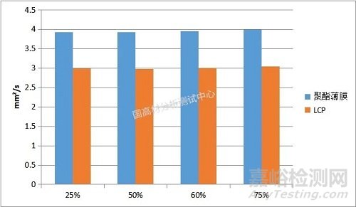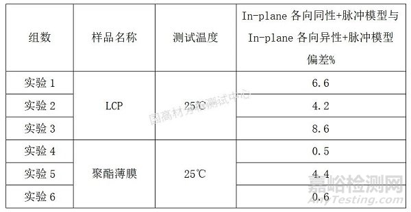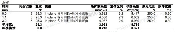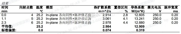 選取了25℃下LCP與聚酯薄膜在In-plane各向同性+脈沖模型下的導(dǎo)熱系數(shù),測(cè)試結(jié)果如下所示: