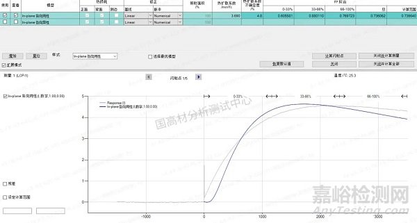 把測(cè)試結(jié)果代入材料參數(shù)框中,利用儀器自帶軟件進(jìn)行導(dǎo)熱系數(shù)的計(jì)算,選用默認(rèn)的In-plane各向同性+脈沖模型進(jìn)行計(jì)算,驗(yàn)證水平支架能夠測(cè)試薄膜樣品。