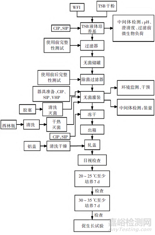 無(wú)菌培養(yǎng)基配制:配制3% TSB液體培養(yǎng)基,按30 gTSB凍干粉配制成1 000 g TSB液體培養(yǎng)基比例配制。按比例取一定量的注射用水置配制罐中,并冷卻至30~35 ℃。按比例稱(chēng)取TSB凍干粉,溶于配制罐中,攪拌溶解,pH控制為7. 3 ± 0. 2,經(jīng)0. 45 μm和0. 20 μm濾芯過(guò)濾后進(jìn)入無(wú)菌儲(chǔ)罐。最差條件的存放時(shí)限后經(jīng)終端0. 20 μm除菌濾芯過(guò)濾至高位罐,進(jìn)行無(wú)菌灌裝加塞操作。