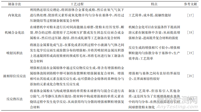 表2 原位合成法制備顆粒增強(qiáng)銅基復(fù)合材料的工藝過程及特點(diǎn)
