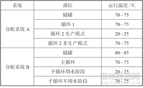 根據(jù)系統(tǒng)配置方案,我們進(jìn)一步細(xì)化了兩個案例系統(tǒng)儲罐和循環(huán)管路設(shè)計溫度,見表2。這兩個案例不同于ISPE 推薦的配置概念流程圖,部分有相通之處,在各個環(huán)節(jié)做了細(xì)致的風(fēng)險分析、設(shè)計計算和工程設(shè)計,重點(diǎn)是不同用水工況或生產(chǎn)模式下溫度的設(shè)置和控制。