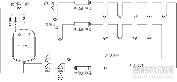 分配系統(tǒng)A 包括高溫循環(huán)1 和常溫循環(huán)2(冷和再熱循環(huán))和兩個平行并列循環(huán)管路,共用一個熱存儲罐。高溫?zé)嵫h(huán)1 全部是熱使用點(diǎn)(70~75 ℃)。常溫循環(huán)2 全部是冷使用點(diǎn)(20~25 ℃),我們設(shè)計生產(chǎn)模式和非生產(chǎn)兩種模式,生產(chǎn)模式下供水溫度自動降到20~25 ℃,而且通過比例調(diào)節(jié)閥,循環(huán)中有20%~30% 的常溫注射用水回儲罐再熱消毒;在非生產(chǎn)模式下系統(tǒng)自動升溫到70~75 ℃循環(huán)。系統(tǒng)流程如圖2 所示。