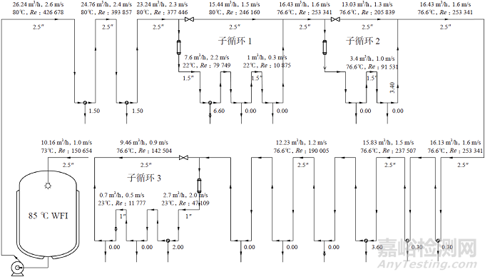(3)子循環(huán)用水時使用點(diǎn)后的管道流速≥ 0.3 m/s 且雷諾數(shù)≥10000(水溫20~25 ℃);