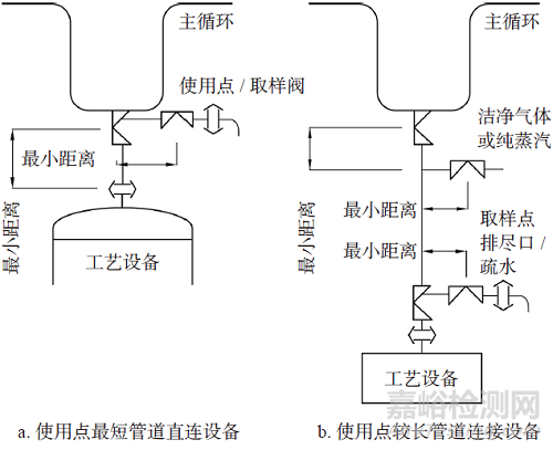 對于連接工藝設(shè)備的使用點(diǎn),很多案例是統(tǒng)一按圖5a 設(shè)計,這是不符合上述要求的,應(yīng)該分兩種情況來設(shè)計:a. 使用點(diǎn)最短管道直連設(shè)備,可以在主管用點(diǎn)閥門上取樣;b. 使用點(diǎn)較長管道連接設(shè)備,必須在靠近工藝設(shè)備處取樣,同時配套吹掃、排盡的設(shè)計,如圖5b。