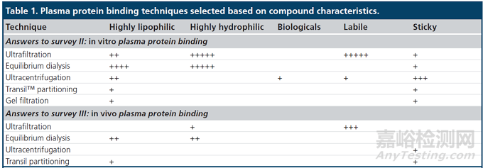 表1:根據(jù)化合物的性質(zhì)選擇血漿蛋白結(jié)合率技術(shù)。從Drug development階段的體外血漿蛋白結(jié)合研究(上表)和體內(nèi)血漿蛋白結(jié)合研究(下表)的調(diào)查中得到答案。符號(hào)的數(shù)量表明該技術(shù)是否被許多公司使用(符號(hào)數(shù)量較多)或僅被少數(shù)公司使用(符號(hào)數(shù)量較少)[3]。
