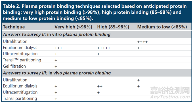 表2:根據(jù)預(yù)期蛋白結(jié)合率選擇血漿蛋白結(jié)合率技術(shù):可分為極高蛋白結(jié)合率(>98%)、高蛋白結(jié)合率(85–98%)和中低蛋白結(jié)合(<85%)。從Drug development階段的體外血漿蛋白結(jié)合研究(上表)和體內(nèi)血漿蛋白結(jié)合研究(下表)的調(diào)查中得到答案。符號(hào)的數(shù)量表明該技術(shù)是否被許多公司使用(符號(hào)數(shù)量較多)或僅被少數(shù)公司使用(符號(hào)數(shù)量較少)[3]。