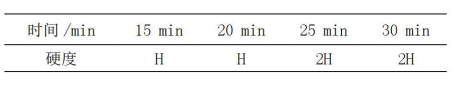 取兩組各4件鍍鋅鋼板樣品,在固化爐溫度達(dá)到180℃時(shí),將樣品分別烘烤15min、20min、25min、30min,出爐冷卻后進(jìn)行檢驗(yàn)。主要檢驗(yàn)項(xiàng)目為色澤、附著力和硬度,檢驗(yàn)情況如下: