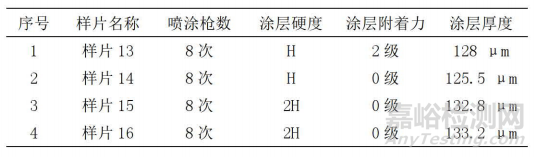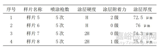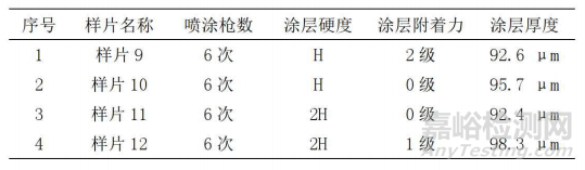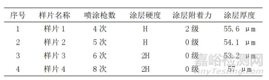 2)附著力:取一組4件樣片,使用百格刀測(cè)試附著力,結(jié)果如表1所示。