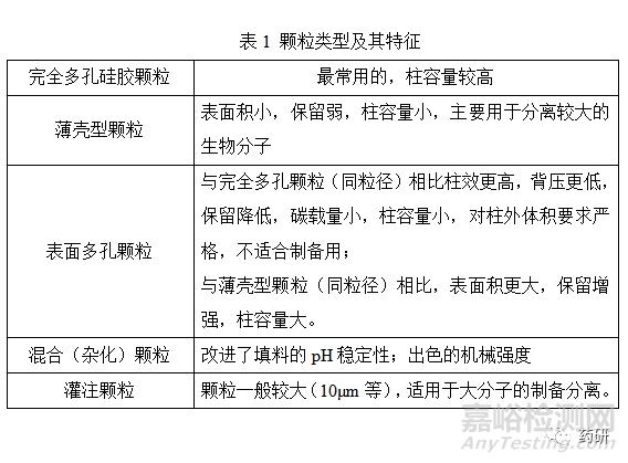 首先呢,我們先來了解一下色譜柱的構(gòu)造。色譜柱的填充主要包括固相載體(主要為硅膠顆粒)及附著在載體上的配合基(C8/C18/Phenyl/PFP等)。顆粒的特征主要分為類型、直徑、孔徑大小和表面積。一般來講,表面積與保留時(shí)間、最大進(jìn)樣量成正比,與孔徑成反比。顆粒類型主要分為完全多孔的硅膠顆粒、表面多孔顆粒、薄殼型顆粒、混合顆粒及灌注顆粒。幾種顆粒類型特征如下表所示。