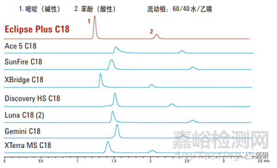 圖2 不同廠家、類型C18柱對(duì)嘧啶、苯酚峰形對(duì)比(圖片來自Agilent)
