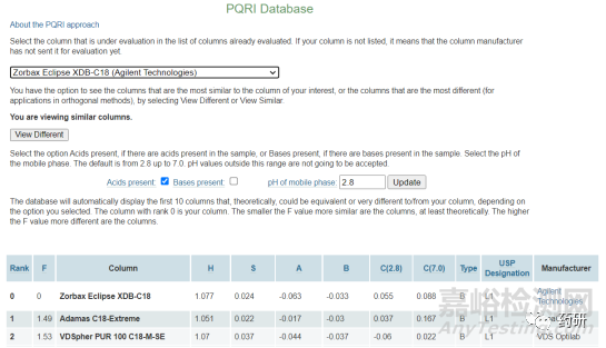 接下來,介紹一下色譜柱的評(píng)價(jià)系統(tǒng)。USP藥典委員會(huì)給出了2種色譜柱評(píng)價(jià)方式——USP方法、PQRI方法。