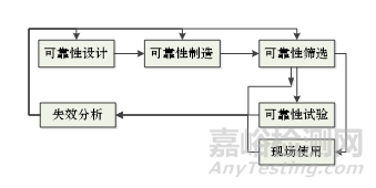 圖1為電子/電器產(chǎn)品可靠性工作基本內(nèi)容的框圖。圖中表示了從產(chǎn)品可靠性設(shè)計(jì)、可靠性制造、可靠性篩選、可靠性試驗(yàn)、產(chǎn)品現(xiàn)場(chǎng)使用以及對(duì)失效產(chǎn)品進(jìn)行失效分析,并將所得到的信息反饋到可靠性設(shè)計(jì)、制造及可靠性篩選中去,以找到相應(yīng)改進(jìn)措施的整個(gè)過(guò)程。