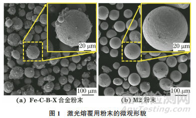 試驗(yàn)原料為采用真空氣霧化法自制的 Fe-C-B-X合金粉末以及M2粉末,其中 M2粉末的化學(xué)成分與M2高速鋼相似。2種粉末的粒徑均為53~150μm,形貌近似球形,如圖1所示。試驗(yàn)用基板為風(fēng)電軸承中常用的調(diào)質(zhì)態(tài)42CrMo低合金高強(qiáng)鋼,尺寸為150mm×70mm×15mm,使用前進(jìn)行精磨,酒精清洗并吹干。激光熔覆前,將粉末放入100℃烘箱中保溫2h。將采用激光熔覆制備的Fe-C-B-X合金涂層記作S1涂層,對(duì)比涂層為采用相同工藝制備的商用M2涂層。