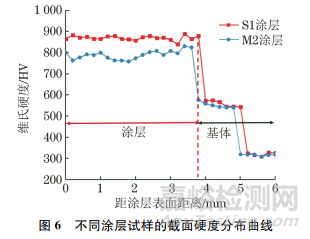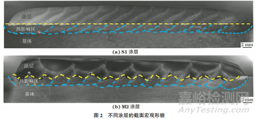 由圖2可知,S1涂層和M2涂層均與基體結(jié)合良好,且涂層的厚度都超過(guò)了3mm,分別為3.54,3.44mm。S1涂層與基體結(jié)合界面平滑,稀釋率小于5%,而M2涂層與基體結(jié)合界面呈波浪狀,稀釋率大于20%。