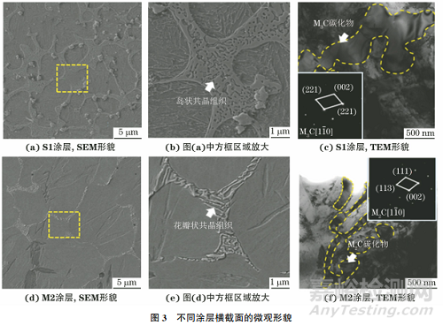 由圖3可見,S1涂層和M2涂層的顯微組織都由馬氏體基體和晶間強(qiáng)化相組成,其中S1涂層中的晶間強(qiáng)化相與基體組織形成了島狀共晶組織。由TEM明場(chǎng)像及相應(yīng)的選區(qū)電子衍射花樣可知,S1涂層中的晶間強(qiáng)化相主要為M3C型碳化物。M2涂層中晶間強(qiáng)化相的形貌與S1涂層相似,也與基體之間形成共晶結(jié)構(gòu),共晶形貌為花瓣?duì)?,?qiáng)化相類型為M2C型碳化物。與S1涂層相比,M2涂層中的共晶強(qiáng)化相尺寸明顯減小。產(chǎn)生該現(xiàn)象的原因主要是在S1涂層中添加了少量的硼元素。硼元素在鐵液中的固/液兩相分配系數(shù)遠(yuǎn)小于1,在凝固過(guò)程中硼元素在晶界處發(fā)生偏析,提高了碳元素在鐵液中的活度,使得碳化物更易在晶界處析出,因此S1涂層中共晶強(qiáng)化相尺寸較大,含量較高。