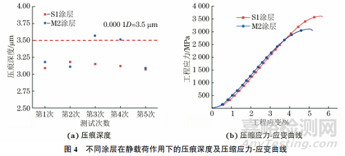 由式(4)可知,在最大許用接觸應(yīng)力相同的條件下,涂層的塑性壓痕深度取決于涂層的屈服強(qiáng)度,屈服強(qiáng)度越高則涂層的塑性壓痕深度越淺。S1涂層的壓縮屈服強(qiáng)度較高,超過(guò)了3500MPa,大于M2涂層的壓縮屈服強(qiáng)度(3000MPa左右),因此S1涂層的平均塑性壓痕深度低于M2涂層。